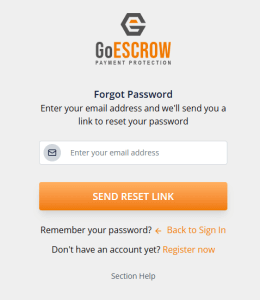 to proceed with password reset, users should input the email address associated with their GoEscrow account and click “Send Reset Link”